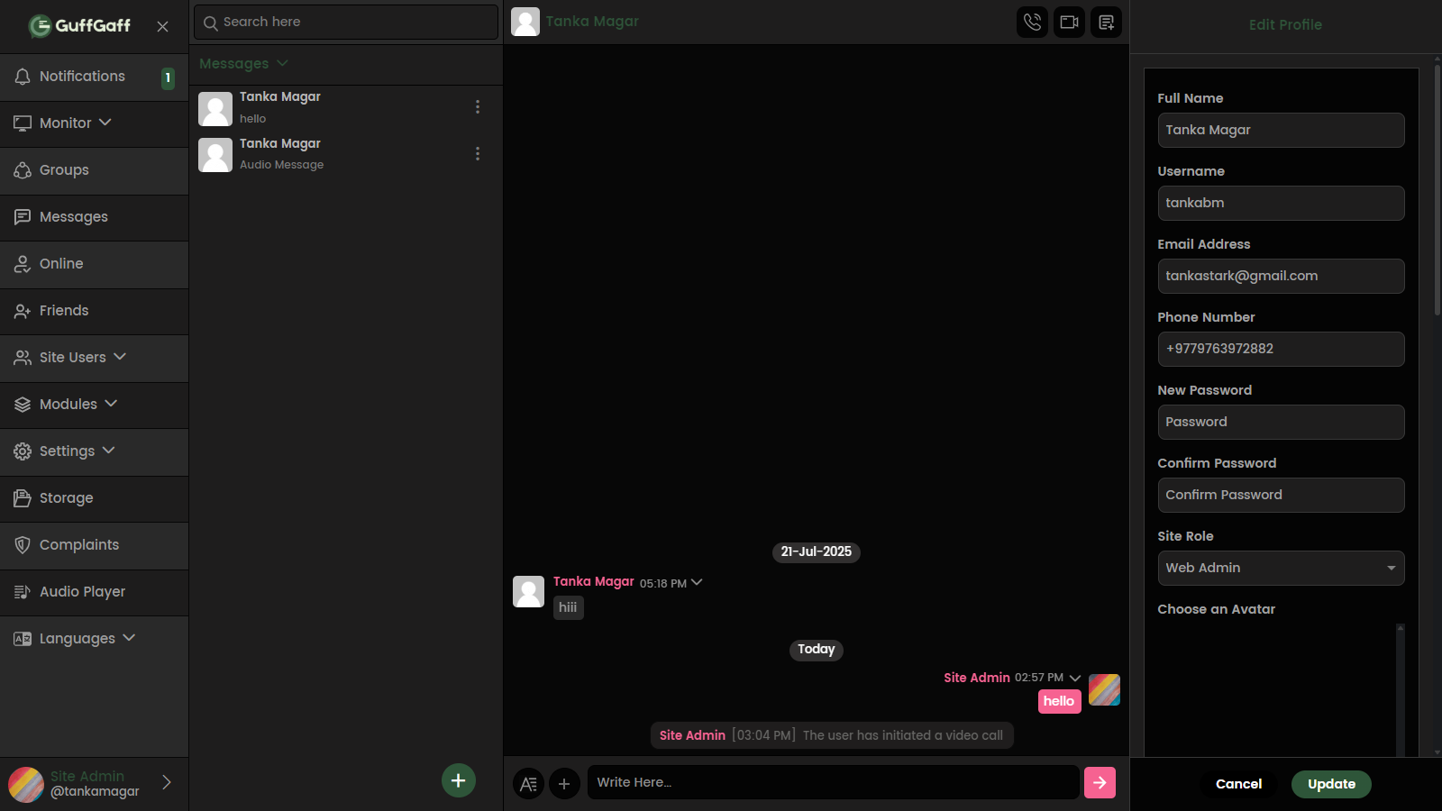 The platform offers a user-friendly interface with personalized profiles, real-time typing indicators, online/offline status, and a message search function. GuffGaff supports voice/video calling through third-party integrations like Agora and incorporates administrative tools for user moderation and platform stability. To enhance engagement, it allows customization through avatars, themes (light/dark), emojis, and GIFs.